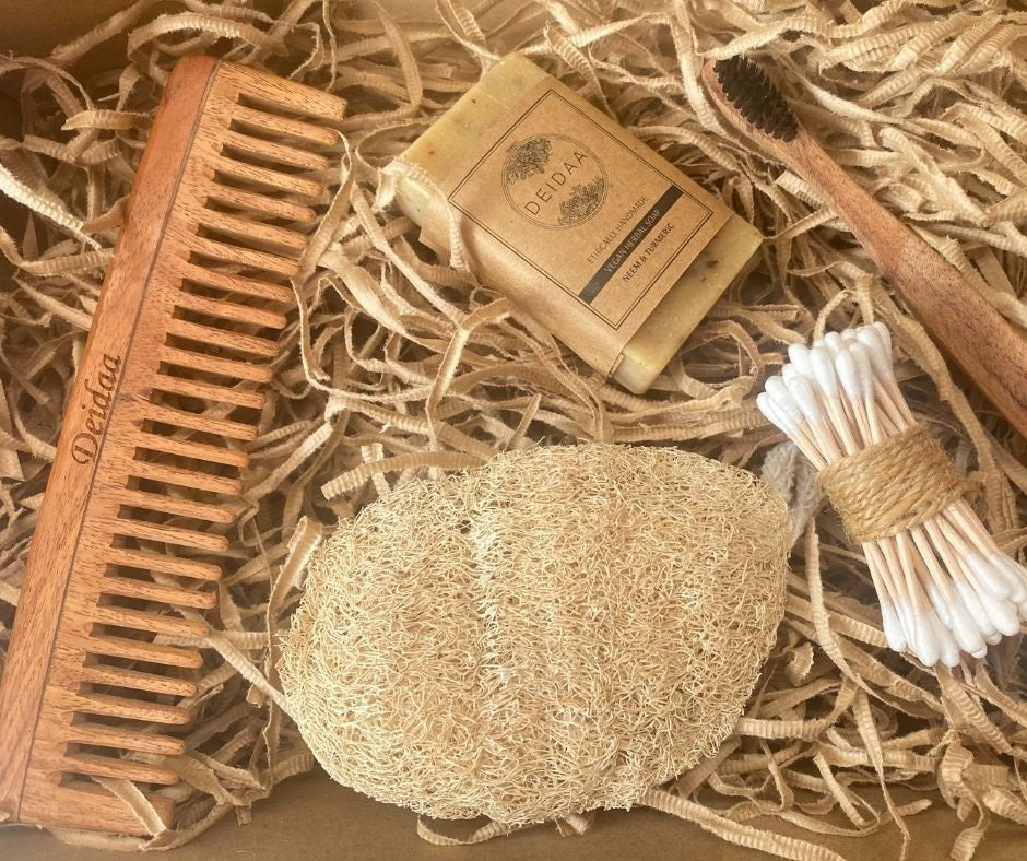 - Gift box contents: Ayurvedic Soap, neem wood comb, neem wood tooth brush, bamboo cotton ear buds (40 units), natural gourd loofah